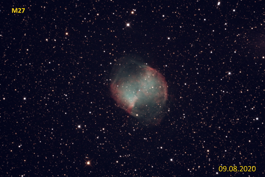 Der Hantelnebel ist ein weiteres "Endprodukt" eines sterbenden Sterns. Dieser Stern hat sein "Leben" hinter sich und befindet sich als "weißer Zwerg" mit ca 14 Magnituden im Zentrum dieses Nebels. |