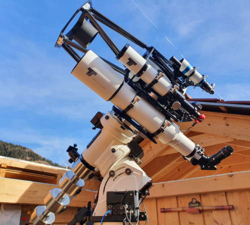 Das Linsenteleskop ist vor allem mit Brennweiten von 200mm bis 1200mm bei Amateurastronomen im Einsatz. Größere Brennweiten führen auch zu immer größeren Linsen, die dann entsprechende Kosten mit sich bringen. Diese "kleineren" Brennweiten sind vielfach bei mittleren bis großen Amateursternwarten (stationär) zusätzlich zu Spiegelteleskopen mit größeren Brennweiten montiert, so dass sowohl großflächige, wie auch kleine Objekte betrachtet / fotografiert werden können. | ![]() |
