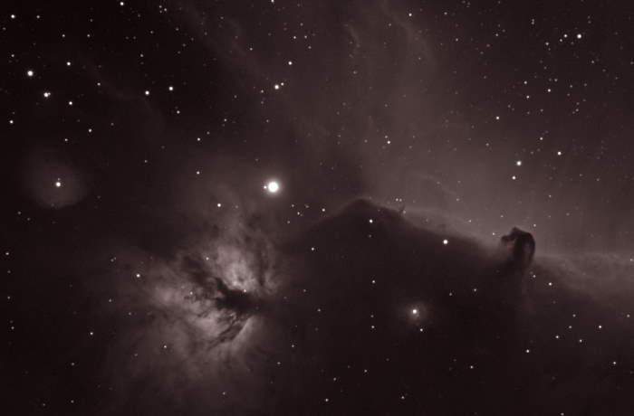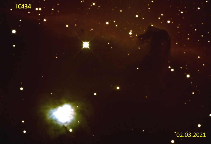 Die Bezeichnung IC 434 steht für einen ganzen Nebelkomplex im Sternbild Orion. Hierin ist die Dunkelwolke mit dem Namen Pferdekopfnebel der markanteste Teil. Hier eine Aufnahme der Umgebung von IC434 im H-alpha Spektrum: