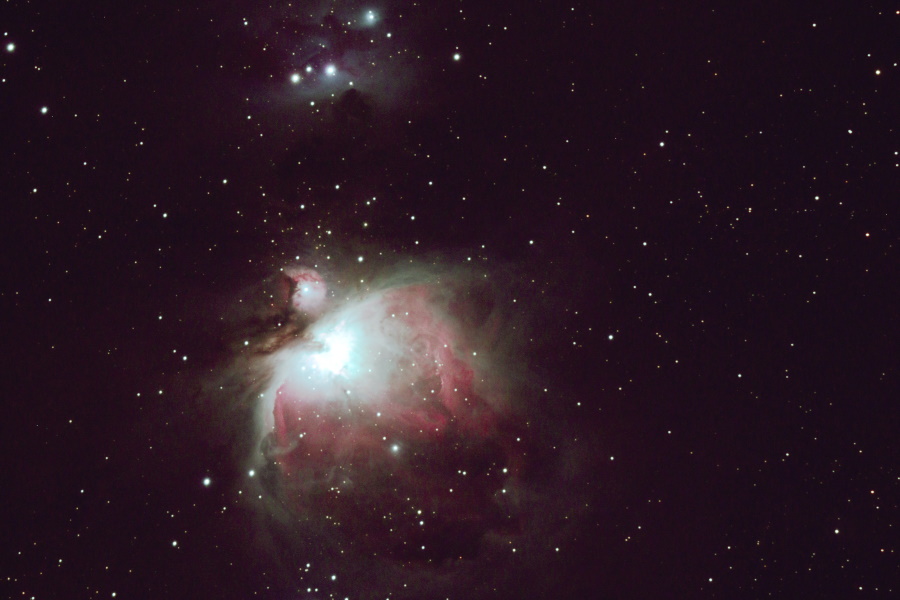 Der Orionnebel gehört zu einem riesigen Komplex von Dunkelwolken, in dem es sehr viele Sternentstehungsgebiete gibt. Dieser Komplex zieht sich vom Sternbild Orion bis weit nach Osten. |