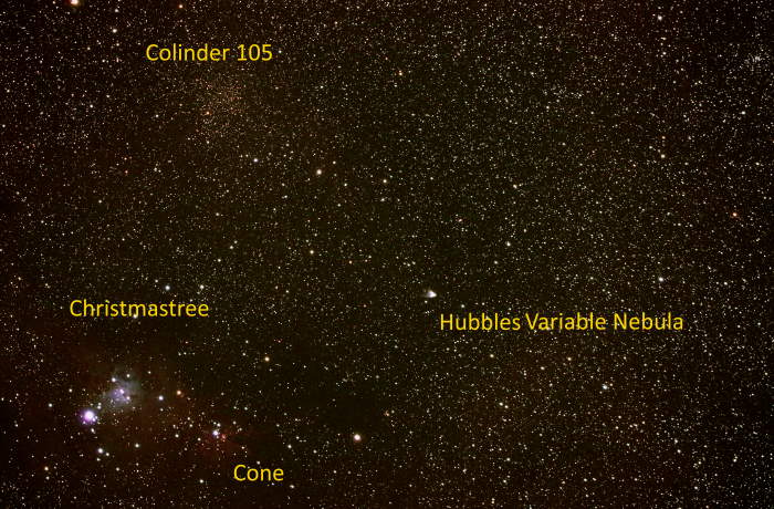 Dieser Nebel ist ein Reflektionsnebel, der nicht selbstständig leuchtet, sondern das Licht eines Sterns "in der Nähe, relativ gesehen" reflektiert. Hier die Umgebung von NGC 2261: