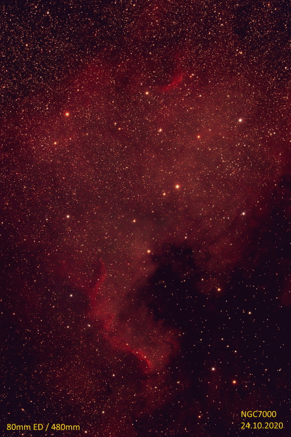 Der Nordamerika Nebel ist ein großes Gebiet von leuchtendem Wasserstoffgas das sich östlich des Sterns Deneb, der hellste Stern im Sternbild Schwan befindet. Diese Aufnahme hier wurde mit einem H-Alpha Filter erstellt, so dass die Bereiche mit Wasserstoffgas besonders hervorgehoben werden.