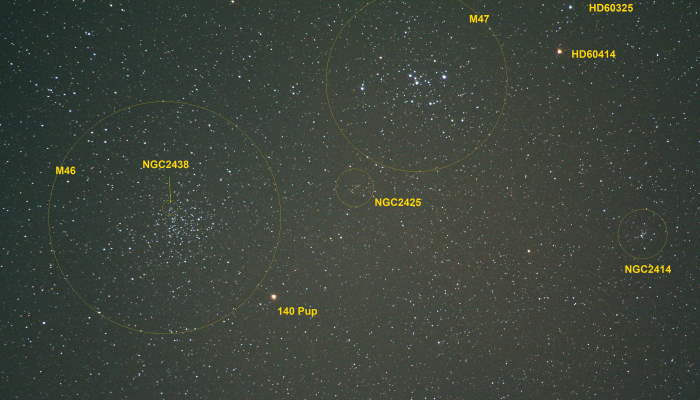 Der offene Sternhaufen ist in der Sichtlinie sehr nahe an M46, obwohl sich die Entfernungen doch sehr unterscheiden. So sieht das Bild mit einem etwas "weiteren Winkel" aus: