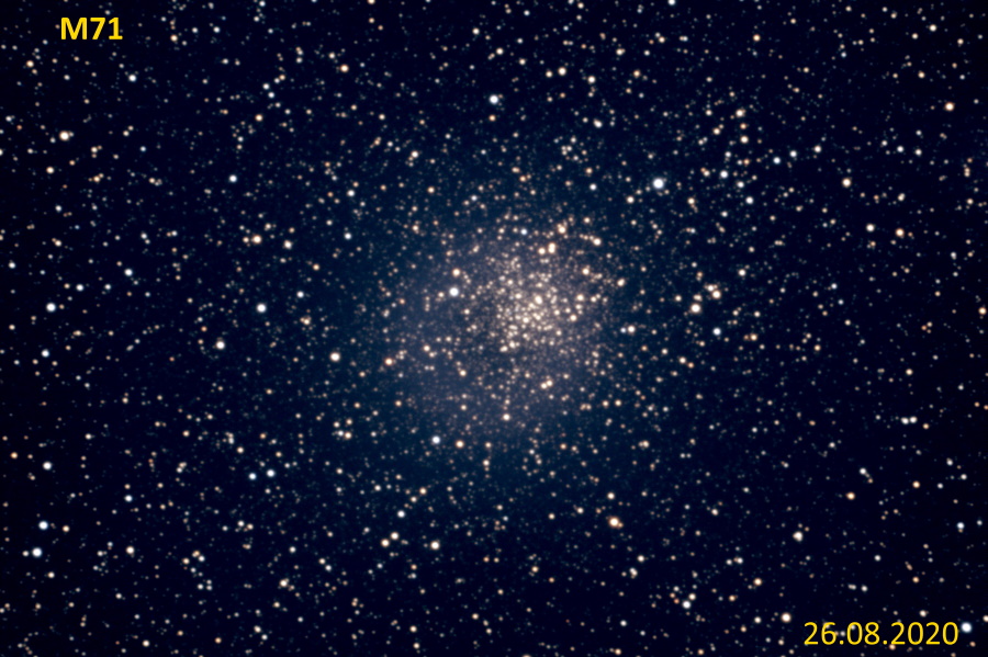 Der Kugelsternhaufen M71 befindet sich im Sternbild Pfeil sehr nahe am Zentrum der Milchstraße. |