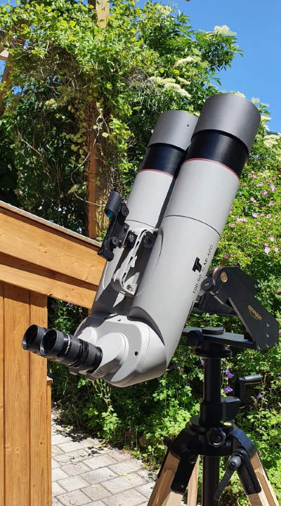 Eine weitere Kategorie von Instrumenten mit der Möglichkeit beide Augen zu benutzen, gibt es noch. Sie gehören zu den Großfeldferngläseren, werden aber oft auch Doppelrefraktor genannt. Da hier im Prinzip 2 Linsenfernrohre (Refraktoren) parallel geschaltet werden und die Augen durch 2 identische Okulare (wie auch eines bei normalen Refraktoren verwendet wird) in den Himmel schauen. Hier gibt es keine feste Vergrößerung, da die Okulare in der Regel durch andere Okulare (mit anderer Brennweite) ausgetauscht werden können und somit auch die Vergrößerung anders gewählt werden kann. Wichtig ist jeweils nur, dass die 2 Okulare, durch die man schaut identisch sind. Solche Doppelrefraktoren sind schon "größere Kaliber" und haben eigentlich im Sinne des "mal eben mitnehmen", nichts mehr mit den normalen Ferngläsern zu tun. Auch wird hier oft eine besondere Art von Stativ verwendet, damit der Doppelrefraktor leicht auch bei längerer Beobachtung dem Sternenhimmel per Hand nachgeführt werden kann. Diese Art von Teleskopen (ja hier kommen wir in einen Bereich, wo Fernglas und Teleskop sich annähern) werden gerne für die Beobachtung von Mond und mit besonderem Schutzfilter auch Sonne, wie anderen großflächigen Objekten am Himmel verwendet. |